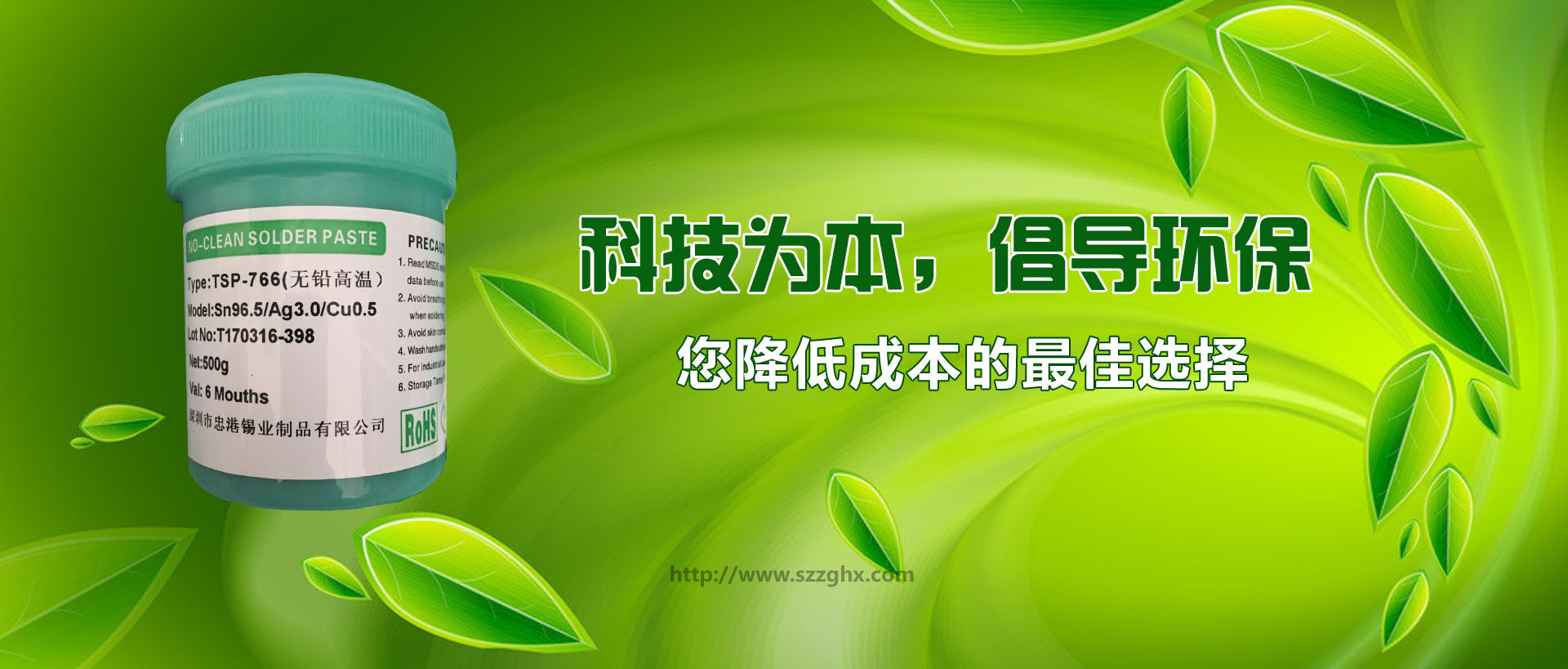 深圳市忠港錫業(yè)制品有限公司以專業(yè)生產(chǎn)、經(jīng)營(yíng)各種規(guī)格和用途的無(wú)鉛焊錫,環(huán)保焊錫,焊錫絲,焊錫條,焊錫線,焊錫膏,低溫錫線,焊鋁錫絲,不銹鋼焊錫絲,無(wú)鉛錫條,無(wú)鉛錫絲,無(wú)鉛錫膏, 無(wú)鉛低溫焊錫絲,無(wú)鉛免洗助焊劑,環(huán)保助焊劑,焊鋁助焊劑,焊鋁錫條,水溶性焊錫絲,不銹鋼助焊劑等為主的電子化工輔料企業(yè)。無(wú)鉛產(chǎn)品己通過(guò)SGS檢測(cè),并獲中國(guó)中輕產(chǎn)品[質(zhì)量、信譽(yù)雙保障示范單位]和國(guó)際ISO9001:2000質(zhì)量認(rèn)證。
